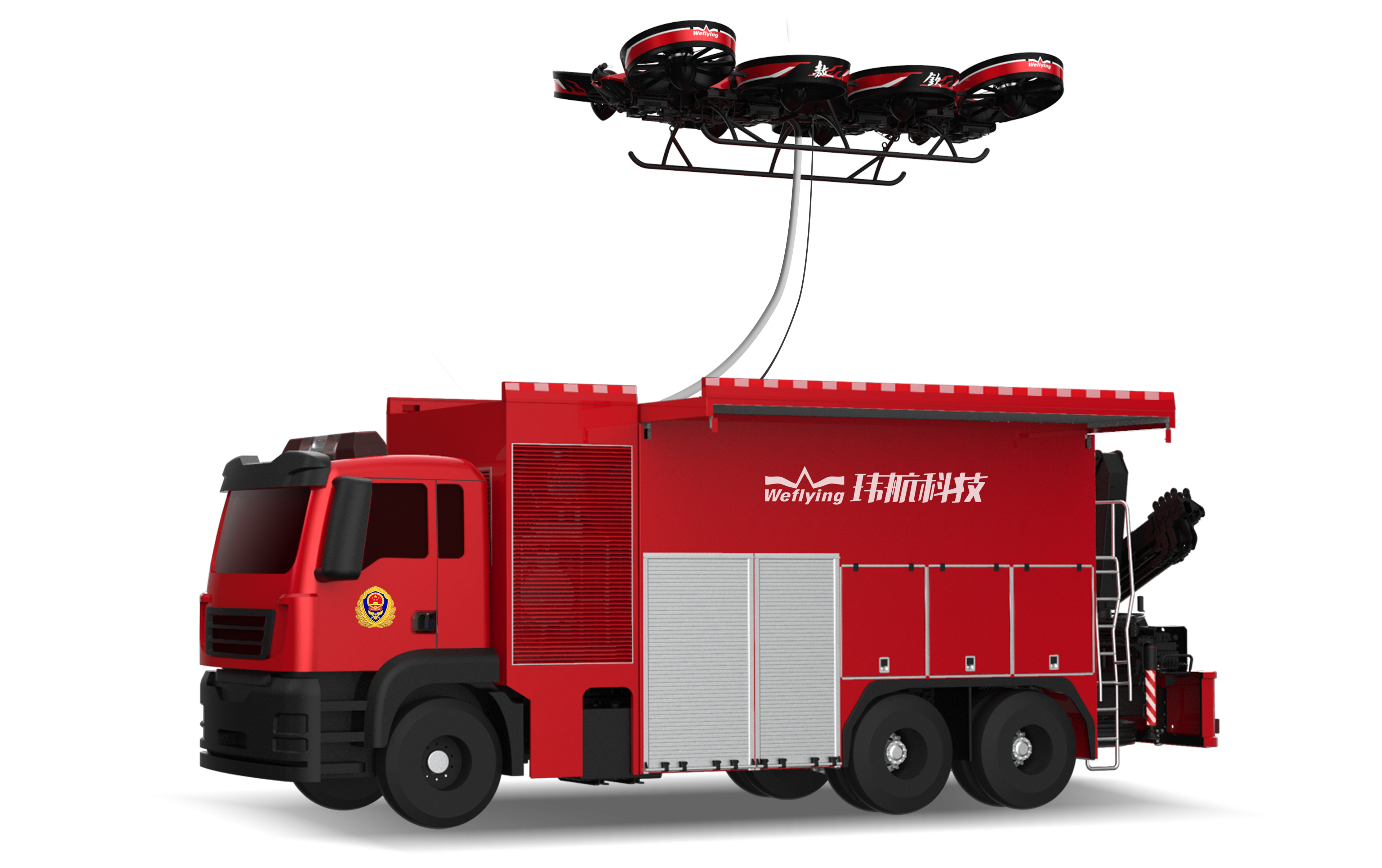 玮航科技全球首创的涵道风扇高空系留主战灭火无人机系统,是大推力涵道风扇飞行平台与消防底盘车的有机融合一体化产品,可实现在消防车整车尺寸仅10*2.55*4米以保证第一时间抵达火灾现场的高消防救援效率的同时、快速飞至百米高度并以20-30L/s的持续液体流量长时灭火的强消防救援能力,是可以完全解决城市高层建筑灭火救援难题的下一代主战装备。