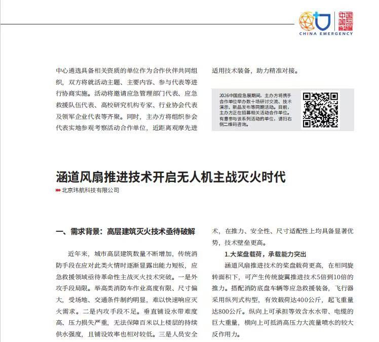 近日,由应急管理部主管的期刊《中国应急管理》杂志在2026年首期刊发了题为《涵道风扇推进技术开启无人机主战灭火时代》的报道文章,重点介绍了玮航科技自主研发的全球首款涵道风扇高空系留主战灭火无人机系统——“敖钦”。作为高层建筑灭火救援领域的颠覆性装备,“敖钦”凭借电动涵道风扇推进技术在大载荷、高灭火效率、紧凑结构等方面的突出优势,实现了百米级高层灭火无人机从“辅助”到“主战”的跨越,展现出我国应急消防救援装备正加速迈向智能化、立体化的新质战斗力时代。