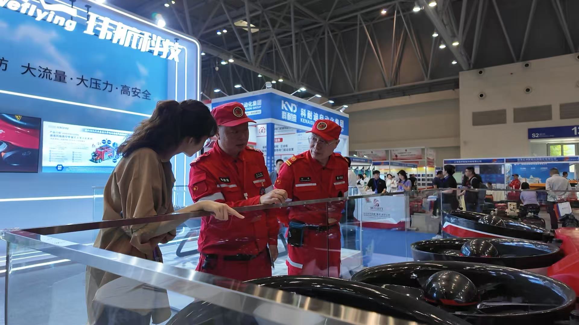 展会期间,福建、陕西、云南、四川、上海、重庆等多地应急消防相关单位人员纷纷到访玮航科技展位参观交流,深入了解涵道风扇无人机技术的实战应用前景。现场工作人员向到访嘉宾详细介绍了产品核心优势——“敖钦”依托电动涵道风扇推进技术,2分钟内即可攀升至100米高空,可携带DN65大口径水带持续大流量喷水,持续液体流量达20-30升/秒、有效射程达45米,还可根据灭火战法需求灵活更换水带口径,灭火效能是传统旋翼无人机的10倍以上。现场观看演示视频后,多位消防从业人员认可“敖钦”和“敖闰”的强大战力与应用价值,并表示非常期待看到它们今后在实战领域的亮眼表现。