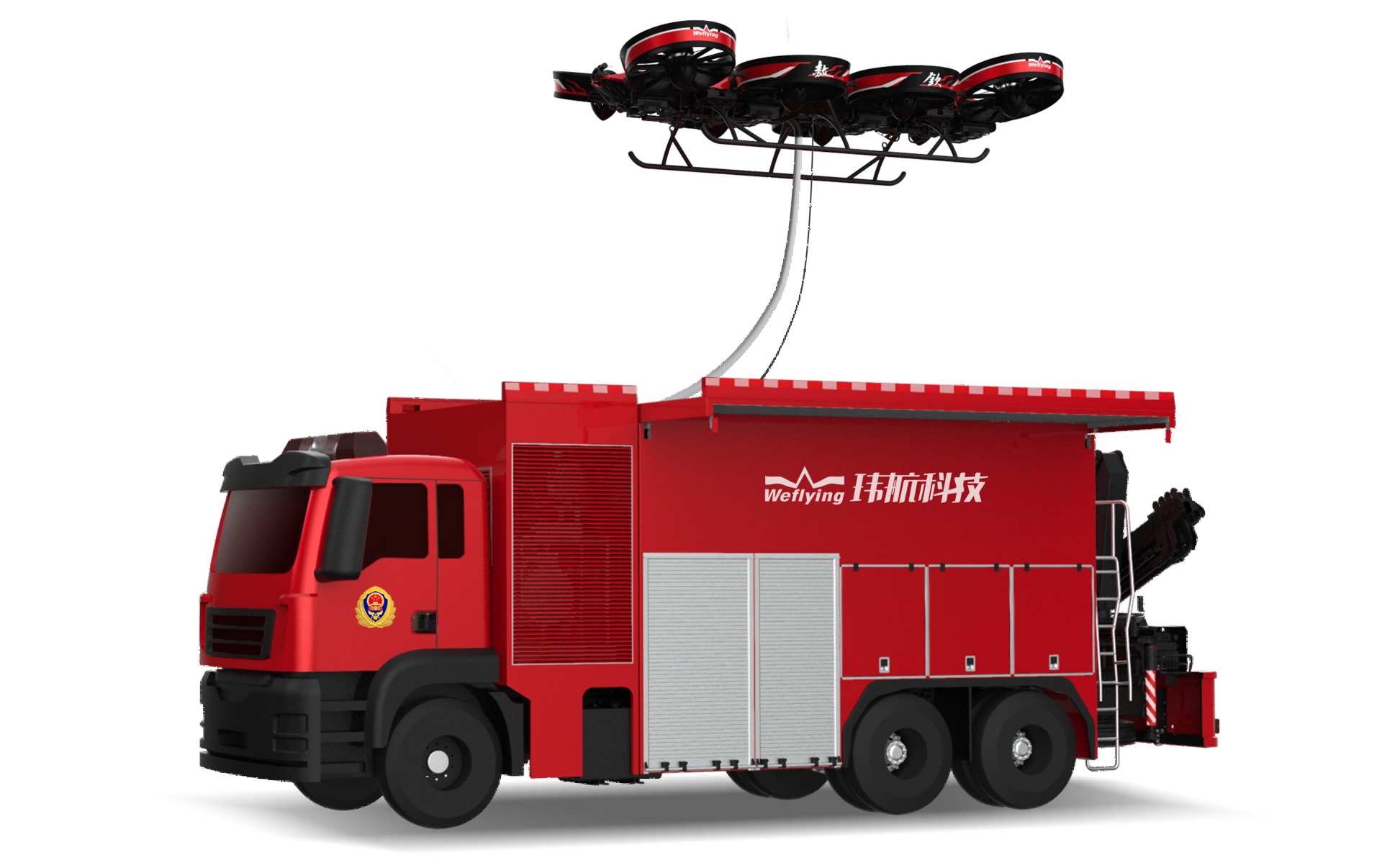 玮航科技全球首创的涵道风扇高空系留主战灭火无人机系统,是大推力涵道风扇飞行平台与消防底盘车的有机融合一体化产品,可实现在消防车整车尺寸仅10*2.55*4米以保证第一时间抵达火灾现场的高消防救援效率的同时、快速飞至百米高度并以20-30L/s的持续液体流量长时灭火的强消防救援能力,是可以完全解决城市高层建筑灭火救援难题的下一代主战装备。