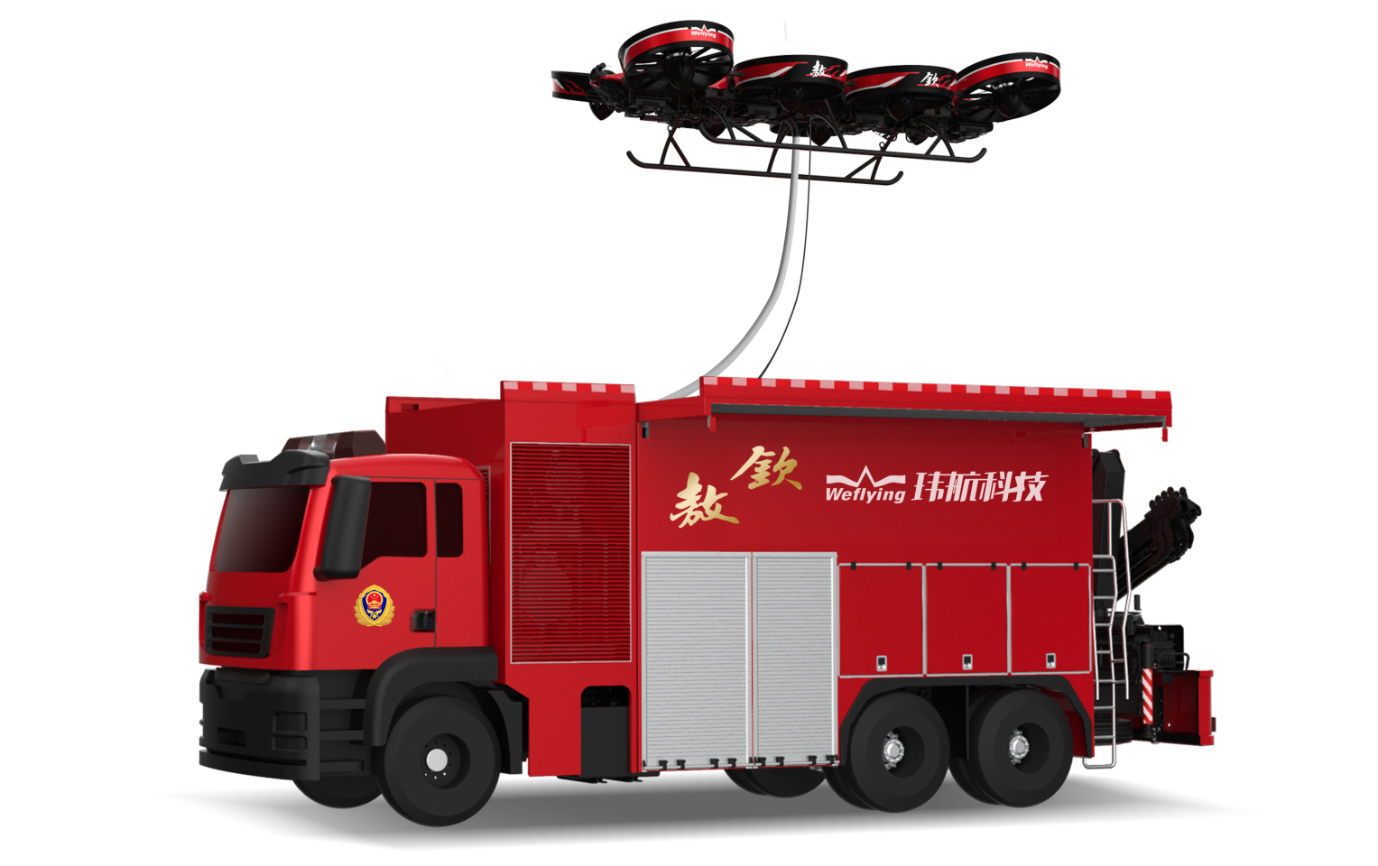Globally pioneering, Weflying has created a ducted fan propulsor based tethered high-altitude firefighting unmanned aerial vehicle (UAV). It is a highly integrated product of high thrust ducted fans with a firefighting truck ground carrier. As so confined within the firefighting truck size (10*2.55*4 meters), this UAV can ensure arrival at a fire spot in the first place to secure instantaneous engagement and rescue effectiveness. It also has strong and endurable firefighting and rescue capabilities to rapidly ascend to 100 meters, meanwhile discharge a spray of fire extinguishing liquid at a continuous volume flow rate of 30L/s. As will be the next-generation main firefighting equipment, this product can thoroughly resolve the global fire rescue challenge for high-rise buildings across cities.